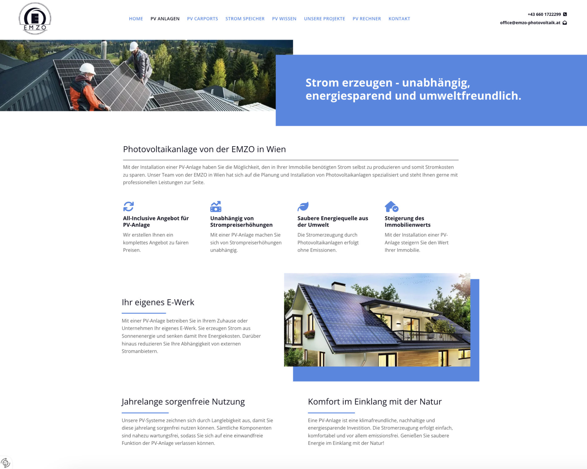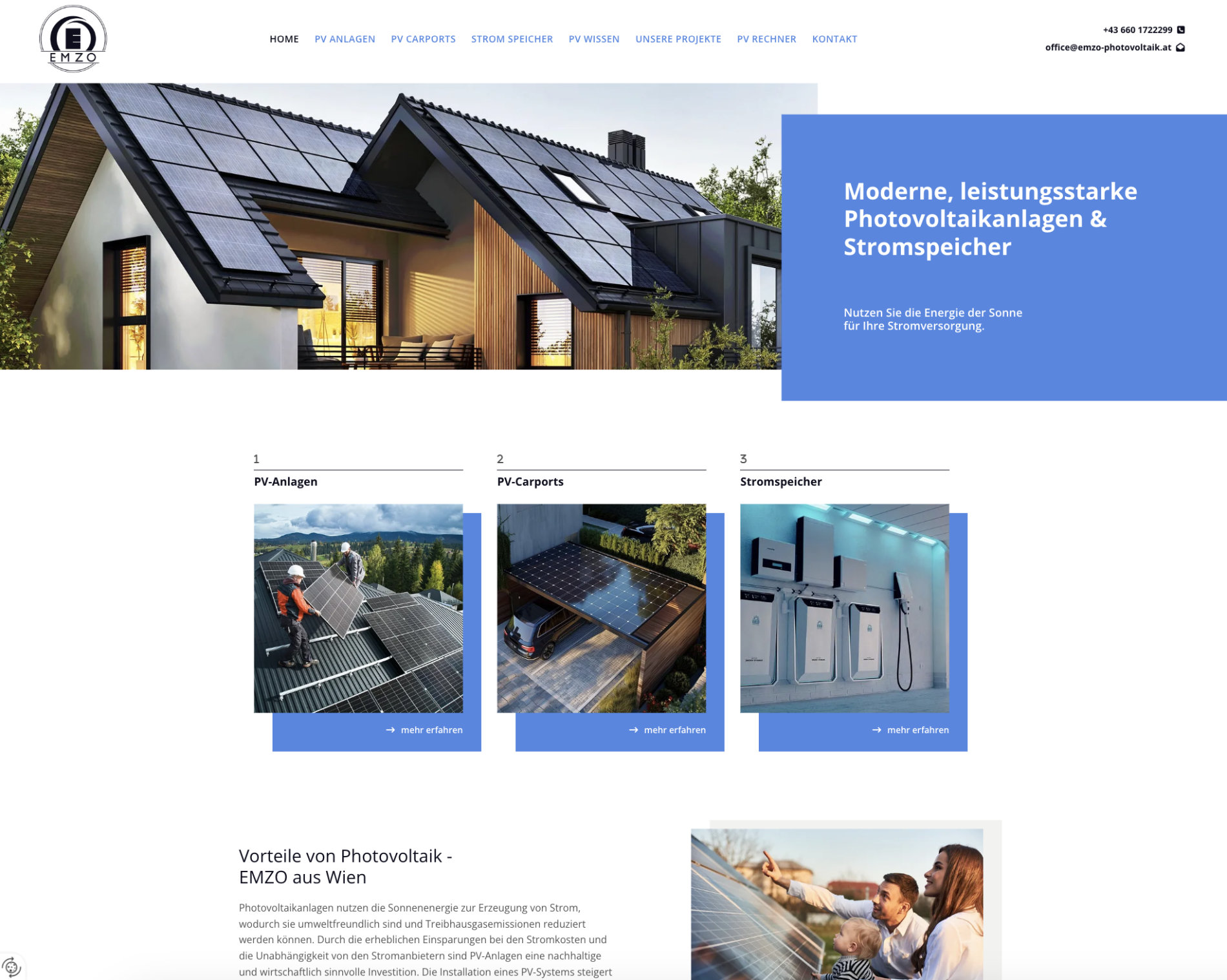 For the client EMZO OG, a provider of tailored photovoltaic solutions based in Vienna, I developed a responsive and SEO-optimized website. The focus was on user-friendly design aligned with the client’s corporate identity and clear communication of their sustainable energy offerings. The website was created based on client briefing and involved multiple rounds of feedback. Note: The current website design may have changed as it is maintained by other teams.